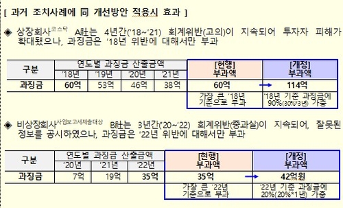 특히 회계부정이 장기간 지속되는 것을 막기 위해 위반 기간·위반 동기별로 차등해 과징금을 가중한다. 지금은 위반금액이 가장 큰 연도의 과징금만 부과한다.또, 고의 회계위반은 위반기간이 1년을 초과하면 1년당 과징금을 30%씩 가중한다.