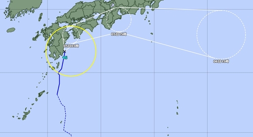 일본 기상청과 NHK에 따르면 태풍은 이날 오후 5시 현재 규슈 미야자키현 미야자키시 남동쪽 30㎞ 해상에서 시속 약 25㎞ 속도로 북진하고 있다.