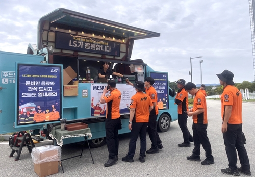 ▲ LS그룹이 최근 극심한 가뭄으로 국가재난사태가 선포된 강릉지역에서 급수 지원을 위해 헌신하는 소방공무원들을 'LS 러브스토리' 3호로 선정했다. LS는 지난해부터 보다 나은 사회를 만드는 것을 목표로 국가와 이웃을 위해 헌신한 개인이나 단체를 발굴 및 지원하고 있다. LS는 소방공무원들의 노고에 감사의 뜻을 표하기 위해 지난 8일부터 5일 동안 강릉 강북공설운동장 인근에서 커피차를 운영하며 아메리카노를 비롯한 음료 7종과 샌드위치 등 간식을 제공한다. (서울=연합뉴스)