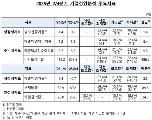 재무 안정성 지표의 경우 전체 기업의 2분기 부채 비율은 89.8%로 전 분기(89.9%)와 비슷했고, 차입금 의존도는 26.6%로 전 분기(25.0%)보다 상승했다.
