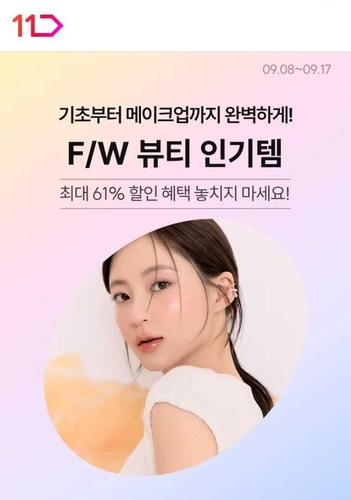 ▲ 11번가 = 11번가는 오는 17일까지 뷰티 제품을 한데 모아 최대 61% 할인 판매하는 'FW(가을·겨울) 뷰티 인기템' 기획전을 연다. 환절기 관리, 클렌징, 메이크업, 추석 선물 등 키워드에 맞춰 상품을 추천한다. 고주파 마사지기와 진동클렌저 등 피부 관리 디바이스와 미용소품, 구강, 면도 제품 등도 판매한다.