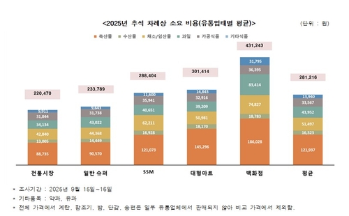 유통업태별 차례상 비용은 전통시장이 22만470원으로 예년과 같이 가장 낮았다. 일반슈퍼는 23만3천789원, SSM 28만8천404원, 대형마트 30만1천414원 순이었다.