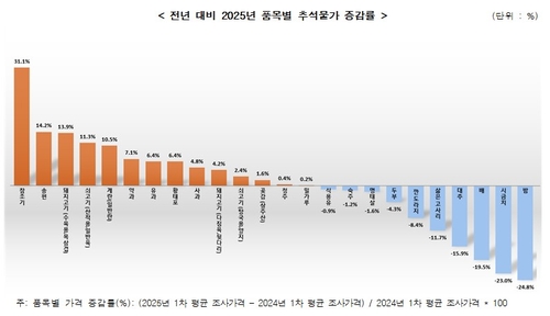 품목군별로는 수산물류(11.6%)와 기타 식품류(11.0%), 축산물류(7.7%)의 가격 상승률이 높았고, 채소·임산물류(-16.0%), 과일류(-4.2%)의 가격은 하락했다.