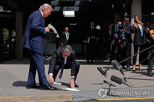 지난 6월 캐나다에서 열린 주요 7개국(G7) 정상회의에서 트럼프 대통령이 서류를 떨어뜨리자 옆에 서 있던 스타머 총리는 허겁지겁 허리를 굽혀 서류를 줍는 모습을 보였다.