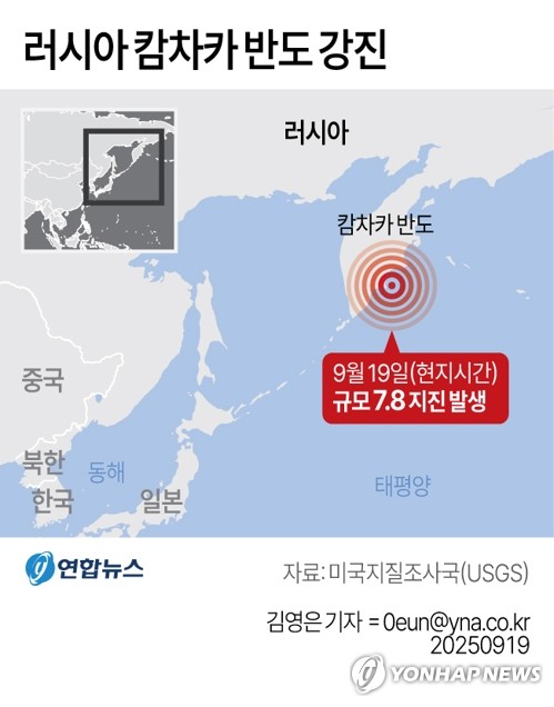 (워싱턴·요하네스버그=연합뉴스) 박성민 유현민 특파원 = 19일 오전 3시58분께(한국시간) 러시아 극동 캄차카반도 페트로파블롭스크캄차츠키 인근 해역에서 규모 7.8의 강진이 발생했다고 로이터통신이 미 지질조사국(USGS)을 인용해 보도했다.