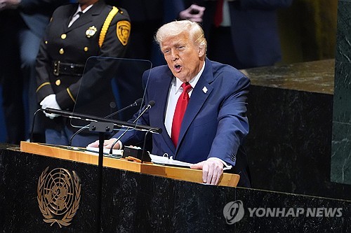 (워싱턴=연합뉴스) 박성민 홍정규 이유미 특파원 = 6년만에 유엔 총회 연단에 선 도널드 트럼프 미국 대통령이 유엔을 향해 국제분쟁 해결에는 무능한 반면, '사기'나 다름없는 기후위기론 설파와 불법 이민자 지원에 앞장서고 있다며 독설을 퍼부었다.