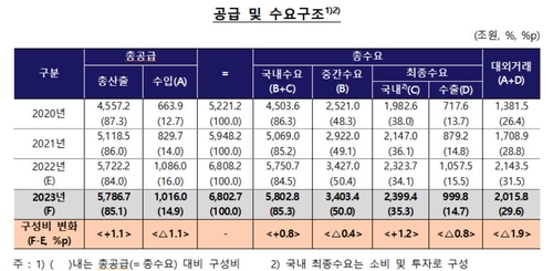 한국은행이 24일 공개한 '산업연관표'에 따르면 2023년 우리나라 재화·서비스 총공급액(총수요액) 6천802조7천억원 가운데 29.6%가 수출과 수입을 더한 대외거래였다. 이 비중은 2022년 31.5%보다 1.9%포인트(p) 감소했다.