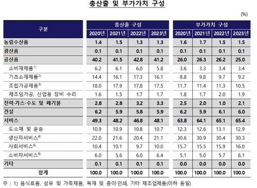 산업 구조를 보면, 총산출액(부가가치+중간투입) 가운데 공산품의 비중이 석탄·석유제품 등 기초소재를 중심으로 1년 새 42.8%에서 41.2%로 줄었다. 반대로 서비스 비중은 전문·과학·기술 서비스 위주로 46.8%에서 48.1%로 늘었다.