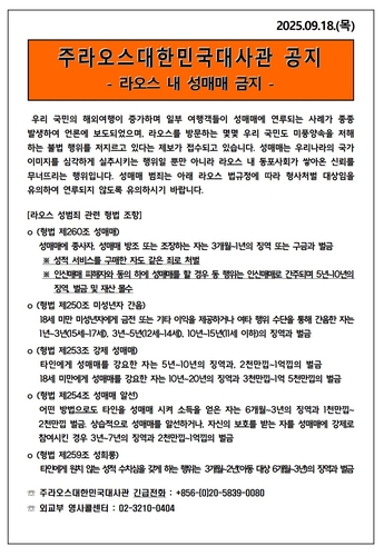 라오스 내 일부 한국인 남성들의 성매매 관광이 문제로 불거지자 주라오스 한국대사관은 지난 18일 홈페이지 공지문을 통해 "성매매는 국가 이미지를 심각하게 실추시키는 불법 행위이며, 라오스 동포사회의 신뢰를 무너뜨린다"고 경고했다.