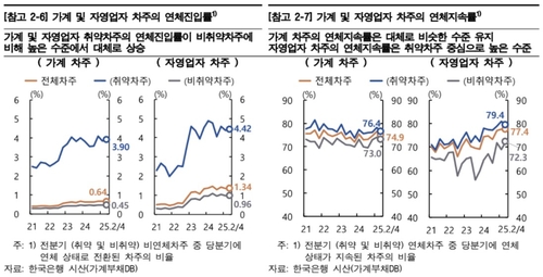 가계 차주의 연체 지속률은 2021년 1분기 말 75.6%에서 올해 2분기 말 74.9%로 하락했지만, 자영업자 차주는 취약차주(71.0→79.4%)를 중심으로 크게 상승했다.