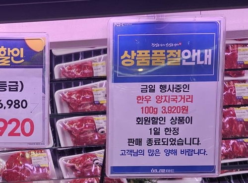 할인가로 선보이는 한우 양지 국거리의 경우 이날 준비한 상품이 모두 판매돼 매대에 '품절' 안내문이 붙기도 했다.