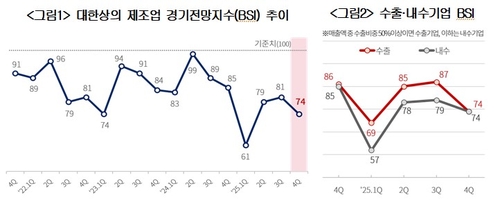 28일 대한상공회의소에 따르면 전국 제조업체 2천275곳을 대상으로 기업경기전망지수(BSI)를 조사한 결과, 4분기 BSI는 74로 집계됐다.