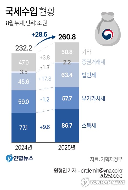 (세종=연합뉴스) 안채원 기자 = 올해 8월까지 국세수입이 법인세와 소득세 증가로 작년보다 28조원 넘게 걷혔다.