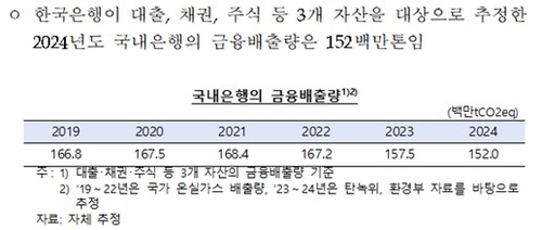 8일 한국은행이 국회 기획재정위원회 소속 조국혁신당 차규근 의원에게 제출한 자료에 따르면, 지난해 국내 은행의 금융배출량은 1억5천200만t으로 추정된다.