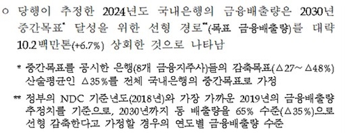 지난해 금융배출량 추정치는 2030년 중간 목표 달성을 위한 경로를 약 1천20만t(6.7%) 상회한 수준이기도 하다고 차 의원은 지적했다.