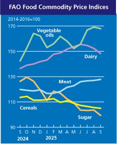 유엔 식량농업기구(FAO)가 3일(현지시간) 발표한 지난 9월 기준 세계식량가격지수(2014∼2016년 평균 가격이 100)는 128.8포인트로 전달(129.7)보다 소폭 내렸다.