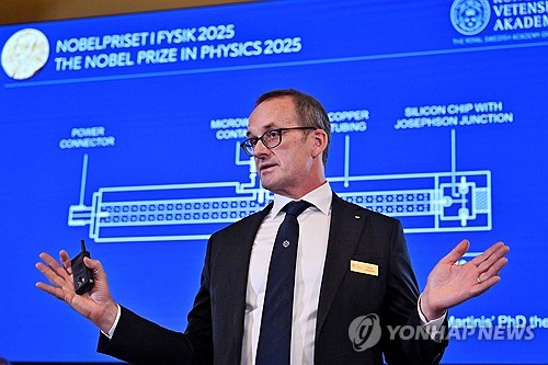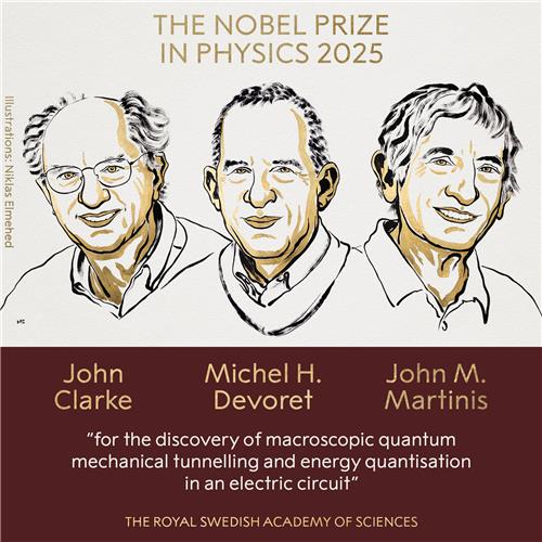 (서울=연합뉴스) 임화섭 기자 = 2025년 노벨물리학상은 거시 규모에서 나타나는 양자역학적 효과를 연구한 공로로 존 클라크, 미셸 드보레, 존 마티니스 등 3인에게 돌아갔다.