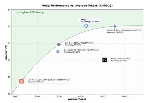 특히 AIME 테스트에서 Ling-1T는 문제당 평균 4천개 이상의 출력 토큰을 사용해 70.42%의 정확도를 기록했다. 이는 구글의 제미나이2.5프로(70.10%)와 비슷한 수준이며 GPT-5(59.43%)와 V3.1-터미너스(55.21%)보다는 높은 정확도를 보였다.