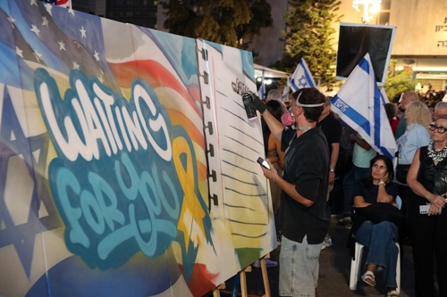 기타 반주에 맞춰 "야세 샬롬, 베알 콜 이스라엘"이라며 평화를 희망하는 히브리어 노래를 떼창하는 소리가 광장에 울려펴졌다. 스프레이 페인트로 "당신들을 기다린다"는 그래피티를 그리는 퍼포먼스도 눈에 띄었다.