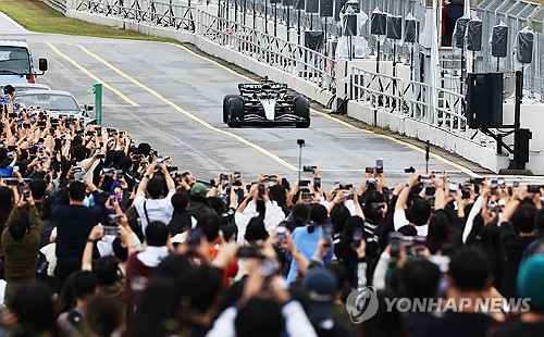 검은색의 포뮬러1(F1) 차량인 '메르세데스-AMG F1 W13 E 퍼포먼스'가 굉음을 내며 트랙을 질주하자 서서 이를 지켜보던 관중들이 일제히 환호성을 쏟아냈다.