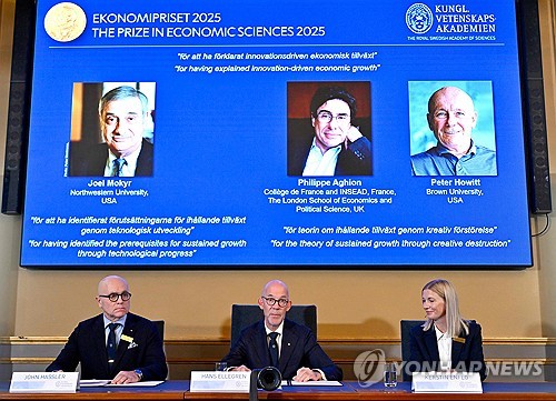 (서울=연합뉴스) 김연숙 기자 = 2025년 노벨경제학상의 영예는 '신기술을 통한 지속가능 성장' 연구에 기여한 경제학자 3인에게 돌아갔다.