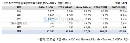 SNE리서치는 "올해 전기차 시장은 성장세는 유지되나 지역별 온도 차도 커지고 있다"며 "유럽과 아시아 신흥국은 다양한 가격대 신차와 보급 정책을 바탕으로 회복세를 이어갔지만, 북미는 정책 전환과 전략 재조정의 영향으로 성장 탄력이 둔화하는 모습"이라고 밝혔다.
