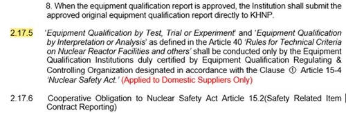 실제로 현재 한수원은 모든 해외 업체에 대해서는 자체 시험성적서만으로 안전등급 전력 제어, 계장케이블과 비안전등급 전력, 조명케이블, 통신용 케이블 등을 공급받고 있다.