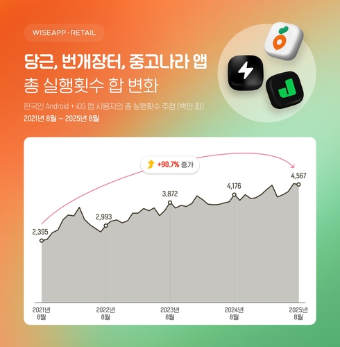 15일 와이즈앱·리테일이 한국인 스마트폰 사용자를 표본 조사한 결과, 지난 8월 기준 당근, 번개장터, 중고나라 앱의 총 실행횟수 합은 4년 전(23억9천500만회) 대비 90.7% 증가한 45억6천700만회로 집계됐다.