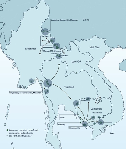 범죄조직들은 공권력이 약한 무장단체 점령 지역이나 특별경제구역(SEZ), 메콩강 유역 국경 지역 등에 자리를 틀고 카지노·호텔·산업단지·과학기술단지 등으로 위장해 범죄를 저지르고 있다.