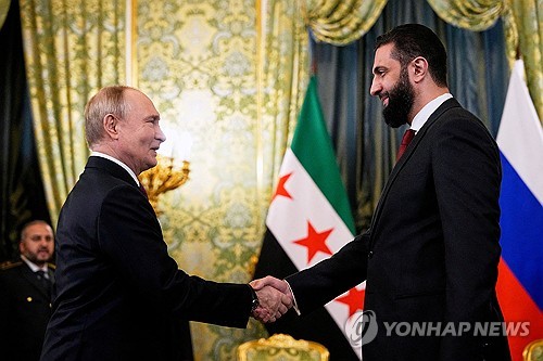 (모스크바=연합뉴스) 최인영 특파원 = 블라디미르 푸틴 러시아 대통령과 아메드 알샤라 시리아 임시대통령이 15일(현지시간) 모스크바에서 회담하며 양자 관계 재정립과 시리아 내 러시아 군사기지 문제를 논의했다.