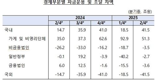 한국은행이 16일 발표한 '2025년 2분기 자금순환(잠정)' 통계에 따르면, 가계(개인사업자 포함)와 비영리단체의 2분기 순자금 운용액은 51조3천억원으로 집계됐다.