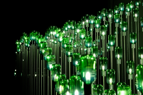 작품은 아모레리사이클 캠페인을 통해 수거한 화장품 공병을 조명 모듈로 재디자인해 인공적이면서도 유기적인 풍경을 구현한다.