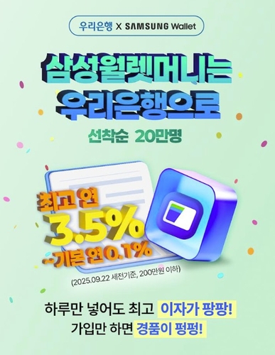 아울러 '삼성월렛 머니 우리적금'은 월 납입 한도 30만원의 자유 적립식 예금으로, 삼성월렛 머니·포인트 연결 계좌를 우리은행으로 지정해야 가입할 수 있다.