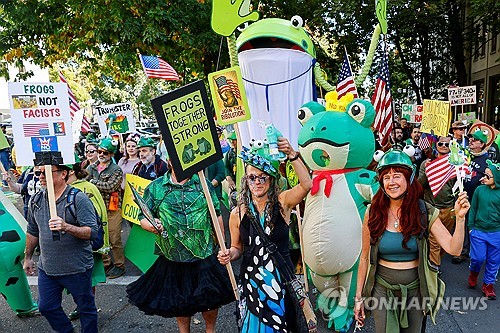 지난 6월 초 이민세관단속국(ICE) 청사 앞에 초록색 개구리 복장을 나타난 세스 토드(24)의 모습이 주목받으면서 이 지역의 유행으로 확산했다고 한다.