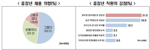 응답 기업의 과반(52.2%)은 50대 이상 중장년을 채용할 의향이 있다고 밝혔다. 인력난을 겪는 기업은 그 비율이 60.7%로 중장년 채용 의지가 높았다.