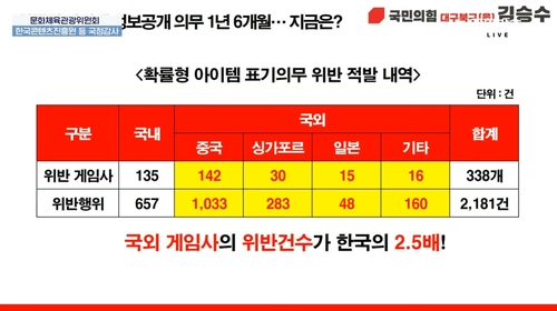 위반행위 건수는 중국 1,033건, 한국 657건, 싱가포르 283건, 일본 48건 등의 순으로, 해외 게임사의 위반행위(1천524건 69.9%)가 국내(657건 30.1%)의 약 2.5배 수준이었다.