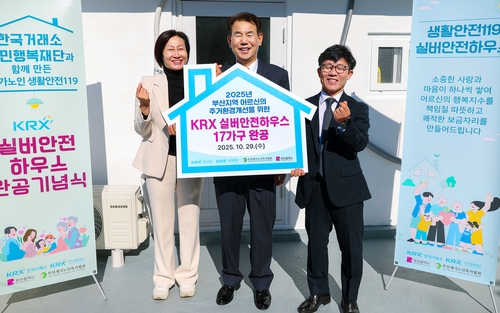 (서울=연합뉴스) 황철환 기자 = 한국거래소는 부산지역 취약계층 독거노인을 위한 집수리 17가구 완공을 기념하는 'KRX 실버안전 하우스' 완공 전달식을 개최했다고 29일 밝혔다.