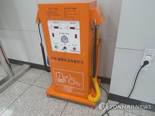 (서울=연합뉴스) 신선미 기자 = 공중이용시설에 설치된 전동휠체어·스쿠터 충전시설의 충전기 5개 중 2개는 안전 관리가 미흡한 것으로 조사됐다.
