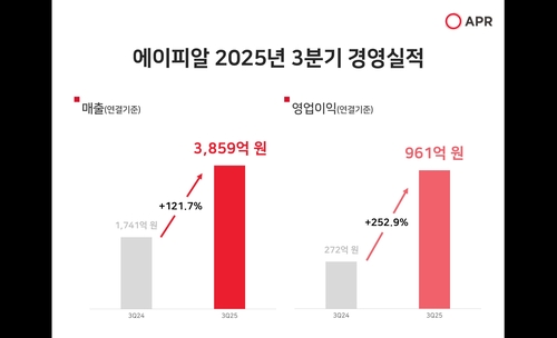 (서울=연합뉴스) 강애란 기자 = 코스피 상장사 에이피알[278470]은 연결기준 올해 3분기 영업이익이 961억원으로 지난해 동기보다 252.9% 증가한 것으로 잠정 집계됐다고 6일 공시했다.