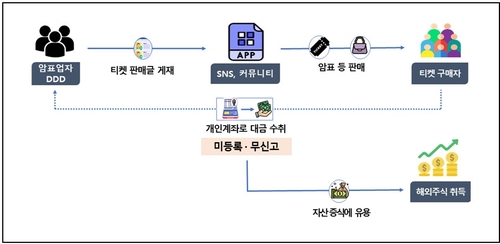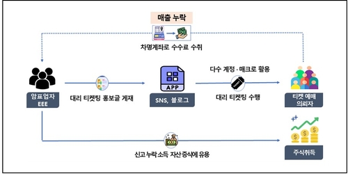(세종=연합뉴스) 이준서 기자 = #. 한류콘텐츠 여행상품을 기획하는 여행사 A사는 중고거래형 암표업체 B사에 티켓당 10만원 상당의 수수료를 지급하고 K팝 콘서트 암표를 대량으로 사들인 뒤 한류 관광객에게 정가의 2.5배에 달하는 가격으로 재판매했다. 이런 식으로 6년간 최소 4만매의 암표를 되팔았다. A·B 업체가 과소신고한 관련 매출만 총 100억원에 달한다.