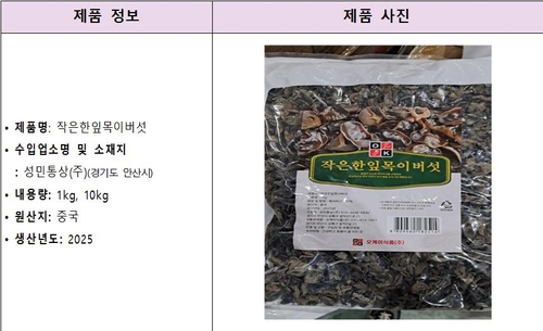 (서울=연합뉴스) 최현석 기자 = 식품의약품안전처는 경기도 안산시 식품 등 수입판매업체 '성민통상'이 수입해 판매한 '목이버섯'에서 잔류농약(카벤다짐)이 기준치(0.01㎎/㎏ 이하)보다 초과 검출돼 해당 제품을 판매 중단하고 회수 조치한다고 6일 밝혔다.