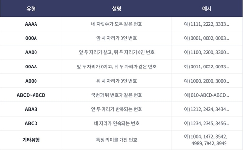 골드번호는 1111, 0002, 3000 처럼 특정 패턴이 있거나 국번과 동일한 번호(ABCD-ABCD, ABAB-ABAB) 또는 특정한 의미(1004, 1472)를 갖는 번호다.