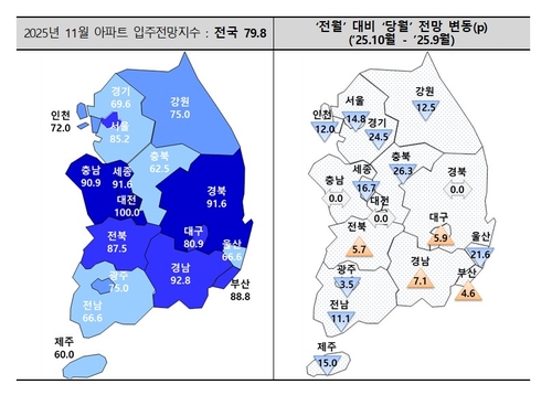 주택산업연구원은 주택사업자를 대상으로 설문한 결과 11월 전국 아파트 입주전망지수가 79.8로 전월 대비 7.9포인트 하락했다고 11일 밝혔다.