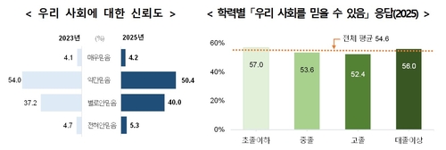 우리 사회를 믿을 수 있다고 응답한 비중은 올해 조사에서 54.6%로 2년 전보다 3.5%p 줄었다. 2019년 관련 조사 이래 처음으로 감소했다.