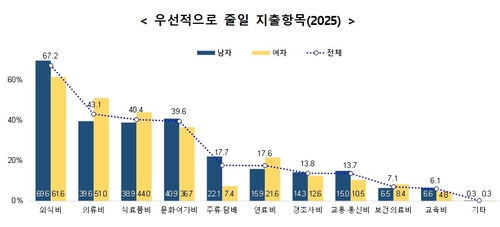 가구의 재정 악화 때 먼저 줄일 지출항목으로는 외식비(67.2%)를 가장 많이 꼽았고, 의류비(43.1%)·식료품비(40.4%)·문화여가비(39.6%) 순이었다. 2년 전과 마찬가지로 교육비(6.1%)는 가장 답변율이 낮았다.