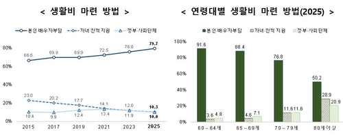 생활비 마련 방법으로는 60세 이상 고령자 5명 중 4명(79.7%)꼴로 본인·배우자 몫이라고 응답했다. 자녀·친척(10.3%) 또는 정부·사회단체(10.0%) 지원을 받는다는 답변은 모두 10명 중 1명꼴에 불과했다.