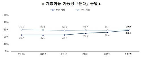 자식세대의 계층상승 가능성에는 '낮다'가 54.1%로 '높다'(29.9%)보다 훨씬 많았다. 각각 2년 전보다 0.1%p, 0.8%p 높아진 수치다.