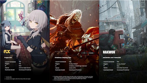 또 차기작으로 ▲ 데이브 더 다이버 모바일(중국 시장) ▲ 프로젝트 DX ▲ 프로젝트 RX ▲ 빈딕투스: 디파잉 페이트 ▲ 낙원: 라스트 파라다이스[034230] ▲ 던전앤파이터: 아라드 ▲ 프로젝트 오버킬 ▲ 우치 더 웨이페어러 등을 제시했다.