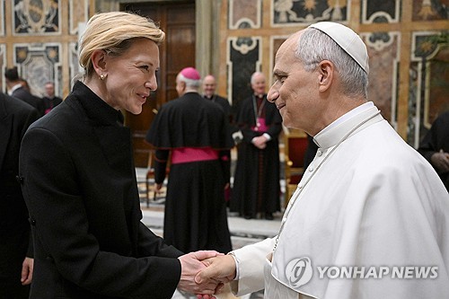 (런던=연합뉴스) 김지연 특파원 = 레오 14세 교황이 15일(현지시간) 교황청 사도궁에서 영화계 스타들을 맞이했다.