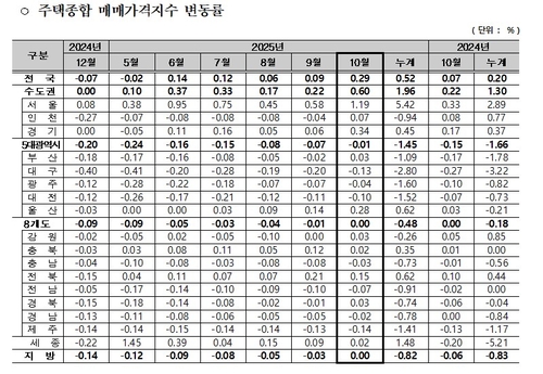 비수도권(-0.03%→0.00%) 주택종합 매매가는 보합 전환했다. 5대 광역시(-0.07%→-0.01%)는 하락 폭을 축소했고 8개 도(-0.01%-0.00%)는 하락에서 보합으로 돌아섰다. 세종(0.09%→0.02%)은 상승 폭이 줄었다.